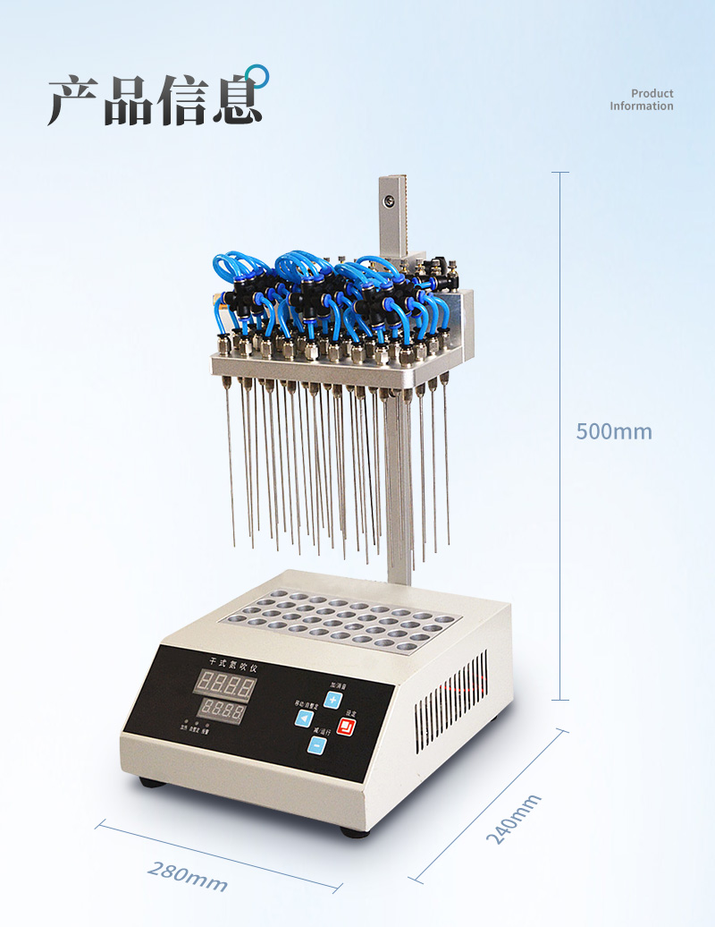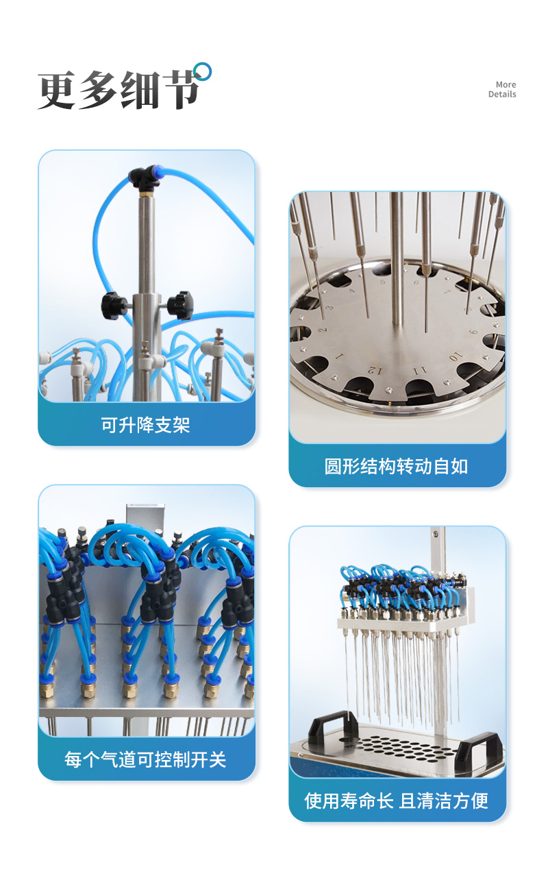 7.圓形氮吹儀的所有部件均勻不銹鋼制造,可耐酸堿等有機溶劑。