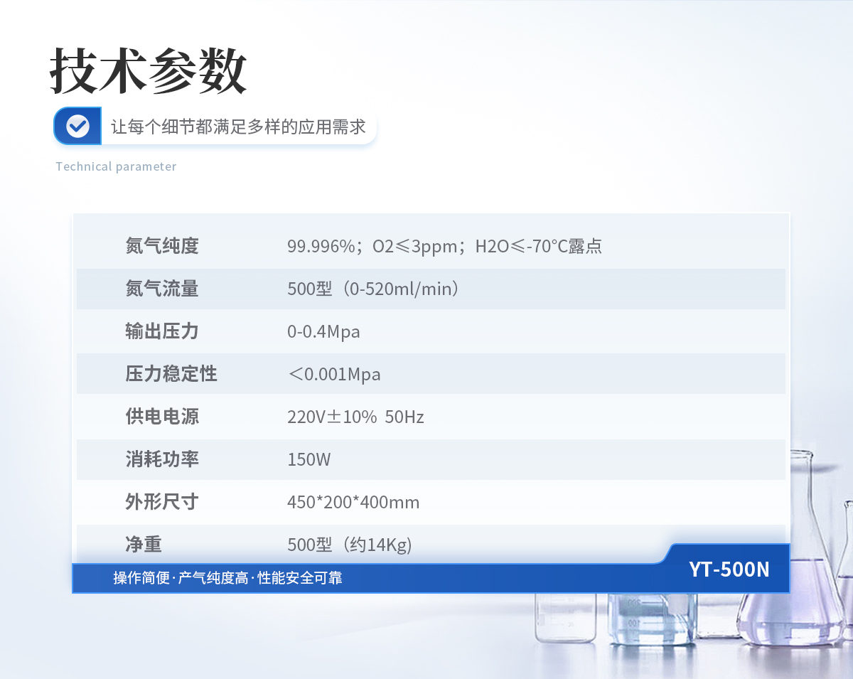 1. 氮氣純度:含氧量<3PPM,含水量露點-56℃ 2. 氮氣流量:0-300ml/min 3. 輸出壓力:0-0.4Mpa(由原料空氣壓力決定) 4. 壓力穩定性:< 0.003MPa(視空氣源的穩定性) 5. 供電電源:220V±10% 50Hz 6. 消耗功率:60W 7. 工作環境:1-40℃ 相對濕度: <85% 8. 外形尺寸:360×200×260mm 9. 凈重:約9Kg