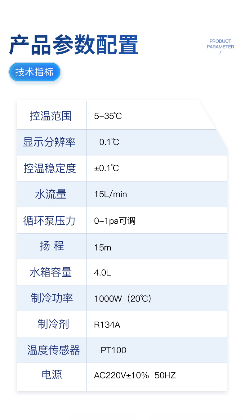 | 電壓:220V AC | 頻率:50HZ | 工作電流:3.2-8.6A | 壓縮機功率:1050W/1.2HP | 制冷量:3KW±5% | 冷媒充注量:R410a/480g | 節流器:毛細管 | **揚程:15m | **流量:12L/min | 水泵功率:55瓦 | 出水口:φ10銅咀寶塔(默認) | 水箱容量:9L | 尺寸:長*寬*高740*480*840mm | 凈重:65Kg | 保護:水流保護、水溫超高報警、水溫超低報警、壓縮機過載保護、室溫超高報警 |