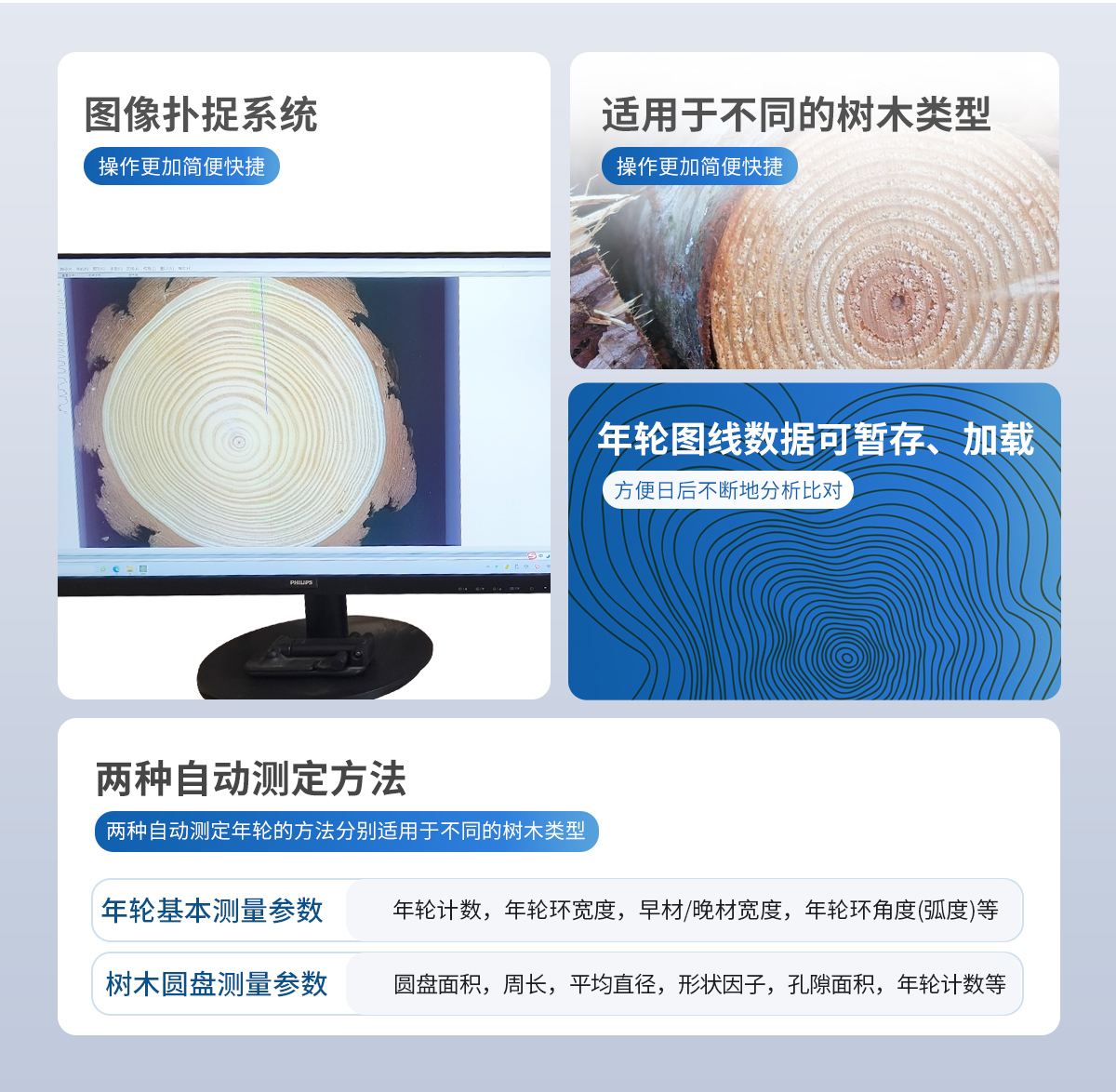 年輪圖像分析系統(tǒng)是一款多平臺圖象分析系統(tǒng),與掃描儀匹配,專門對盤狀的木材截面或柱狀的生長錐樣本進行樹木年輪的測量。大型木材樣本可在不同部位多次分別成像;特殊的樹芯定位器用以放置柱狀樣本;兩種自動測定年輪的方法分別適用于不同的樹木類型;人工輔助的圖像識別校正和遺漏像素添加功能;此外,可自動設置裂縫與年輪角度的切線,以保證測量的精準性;另外,附加功能可進行植物的標準生長分析,如莖干平均半徑、直徑以及總體截面積;樹木高度、體積、樹齡等。對于所分析的年輪圖像可同時顯示如下參數(shù):年輪寬度、早材/夏材寬度、年輪**/*小密度/平均密度、早材/夏材等。