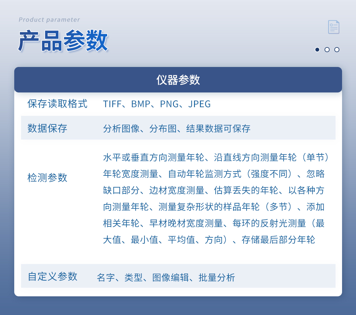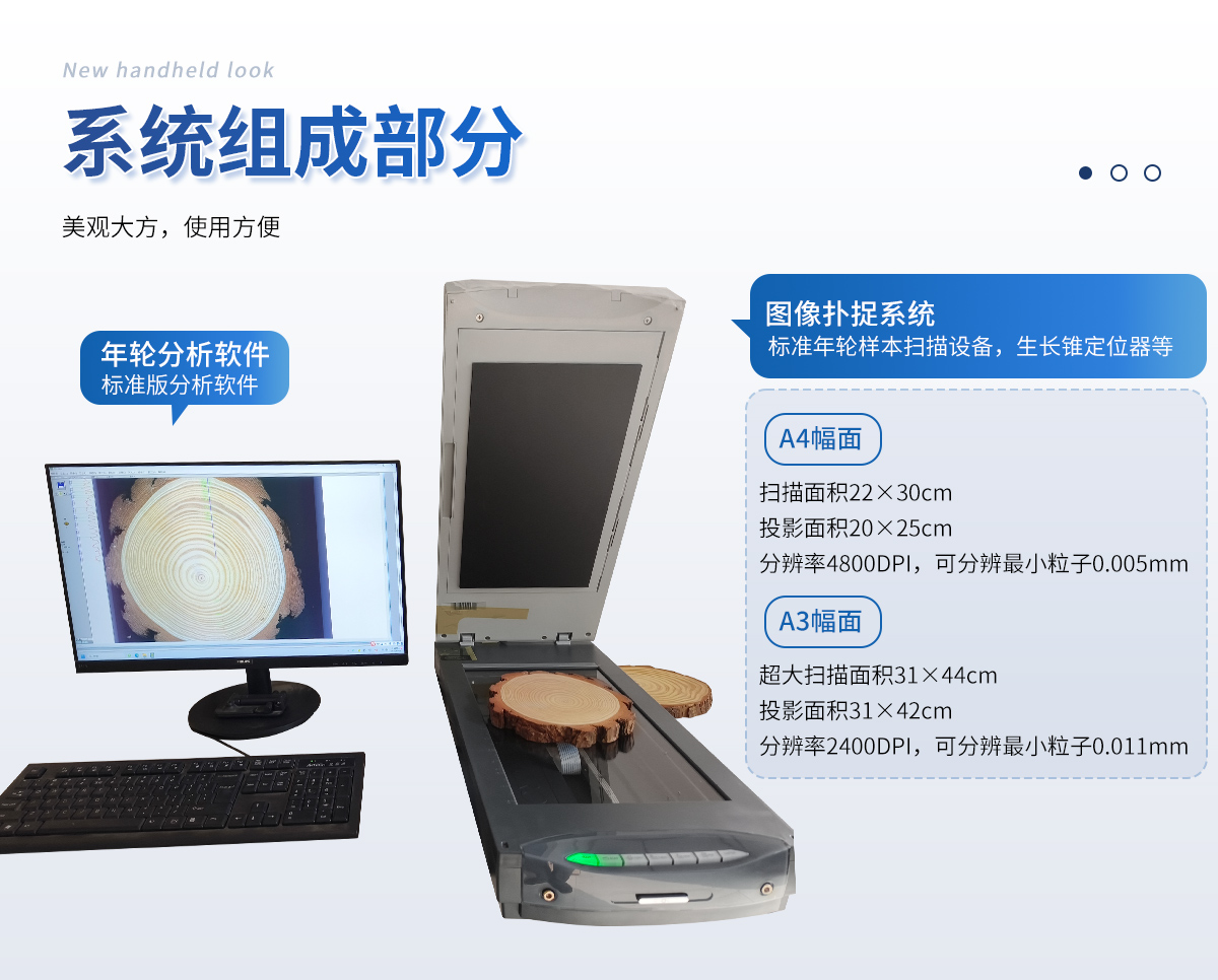 圖像撲捉系統(tǒng):標準年輪樣本掃描設備,生長錐定位器等。 A4幅面:掃描面積22×30cm,投影面積20×25cm,分辨率4800DPI,可分辨*小粒子0.005mm A3幅面:超大掃描面積31×44cm,投影面積31×42cm,分辨率2400DPI,可分辨*小粒子0.011mm 年輪分析軟件:標準版分析軟件。