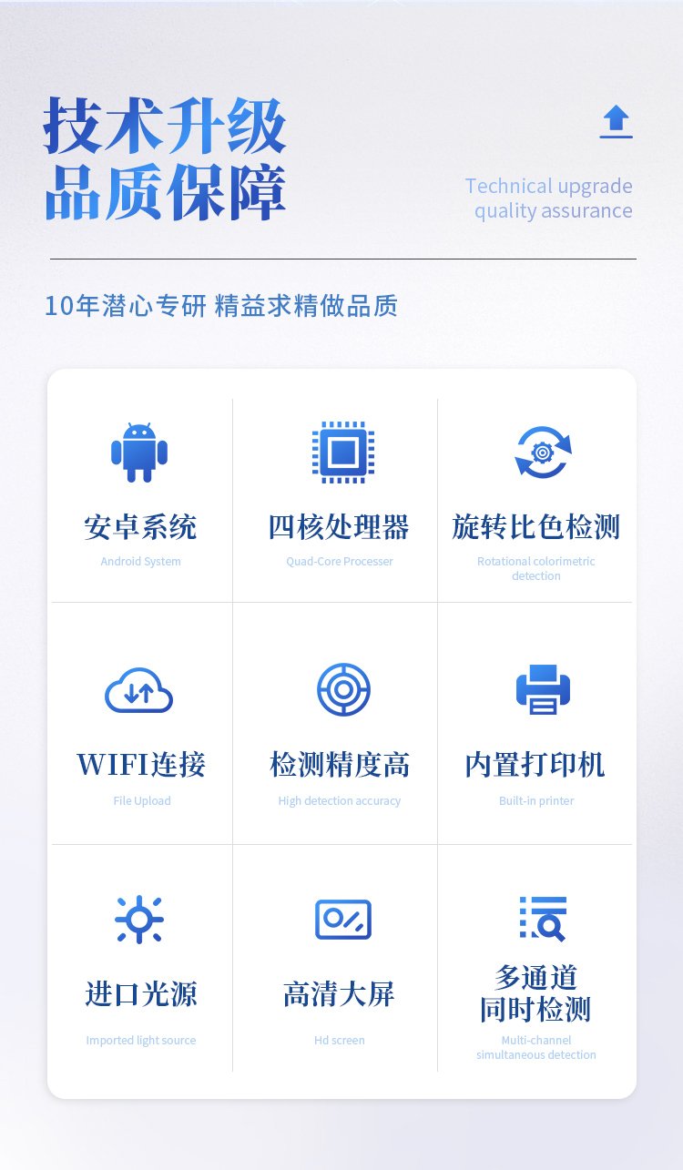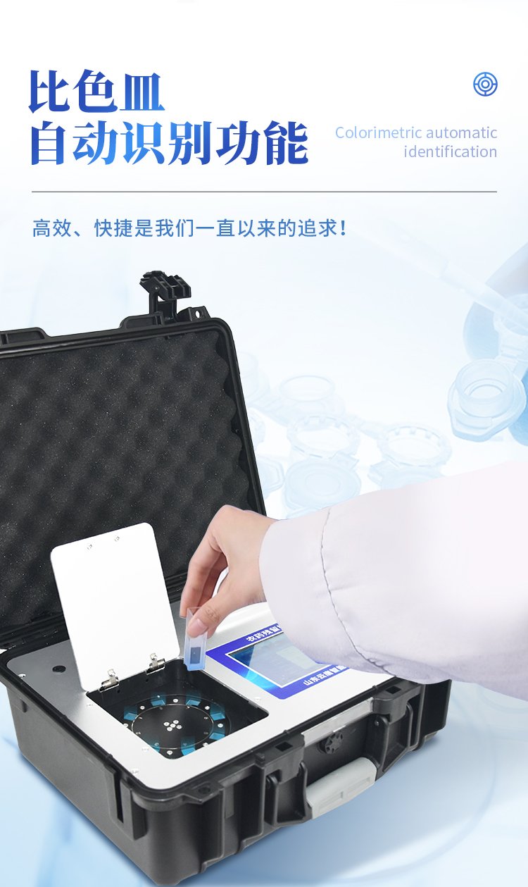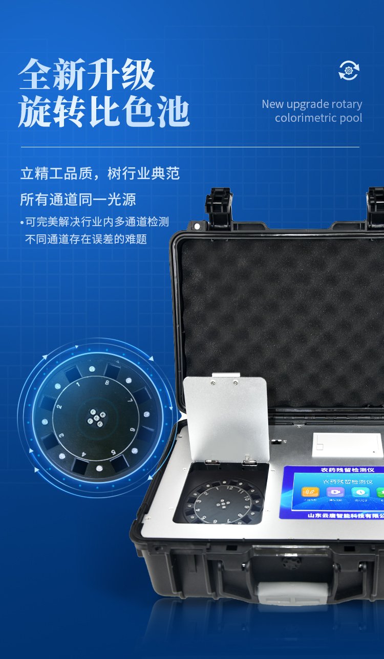 | 機器采用全新安卓智能系統,主控芯片采用 ARM Cortex-A7,RK3288/4核處理器,主頻1.88Ghz,運轉速度更快速,穩定性更強。 | 創新檢測模式: *儀器采用精密旋轉比色池設計,使用光源一致,可以解決各通道間由于光源誤差帶來的檢測結果誤差問題,檢測結果更加精準。 *儀器具有自動識別比色皿檢測功能,即:將樣品比色皿放入儀器后,點擊樣品檢測,儀器自動識別比色皿進行通道檢測。 | 供電方式:交直流兩用,直流 12V 供電,可連接車載電源,可配 6ah 大容量充電鋰電池,方便戶外流動測試。 | 顯示方式:7英寸液晶觸摸屏顯示,人性化中文操作界面,讀數直觀、簡單。 | 檢測通道:12個檢測通道,可以同時測試多個樣品,循環檢測,即放即檢,每個樣品由程序控制分別獨立工作,不會互相干擾。 | 高精光源系統: ①儀器光源采用進口超高亮發光二極管,光源亮度可以自動調節與校準 ②智能恒流穩壓,光強自動校準,長時間連續工作光源無溫漂現象。 | 智能操作分析系統: ①儀器具有100多種蔬菜名稱菜單庫,分類管理,并可按需添加或刪除、編輯蔬菜名稱;可在同一檢測界面自動對應相關檢測通道一次性選擇1-24個樣品名稱,無需退出界面,節省操作時間。 ②內置新國家限量標準,與所測結果進行現場比對,并持續更新標準。 | 完善的配套硬件: ①采用串口5v打印機,可選擇手動打印或者自動打印,三分鐘出打印結果,打印格式為檢測人姓名、吸光度差值、檢測時間、檢測機構、樣品名稱及結果判定。 ②儀器具有無線上傳模塊,檢測結果可批量打印,批量上傳。 | 數據調用: ①儀器可存儲20萬條檢測結果, ②檢測結果為Excel表格,方便后期進行數據分析與匯總報告 ③儀器采用USB2.0接口設計,支持 U 盤存儲,方便數據的存貯和移動,并可隨時與計算機直接相連,實現數據查詢、瀏覽、分析、統計、打印等。 | 后期產品固件可升級。 | 安全證書,放心保障:儀器具有中國計量科學研究院校準證書,權威認證,使用放心。 | 機箱采用工業級ABS工程塑料箱,方便攜帶,穩固耐用,便于流動測試。 |