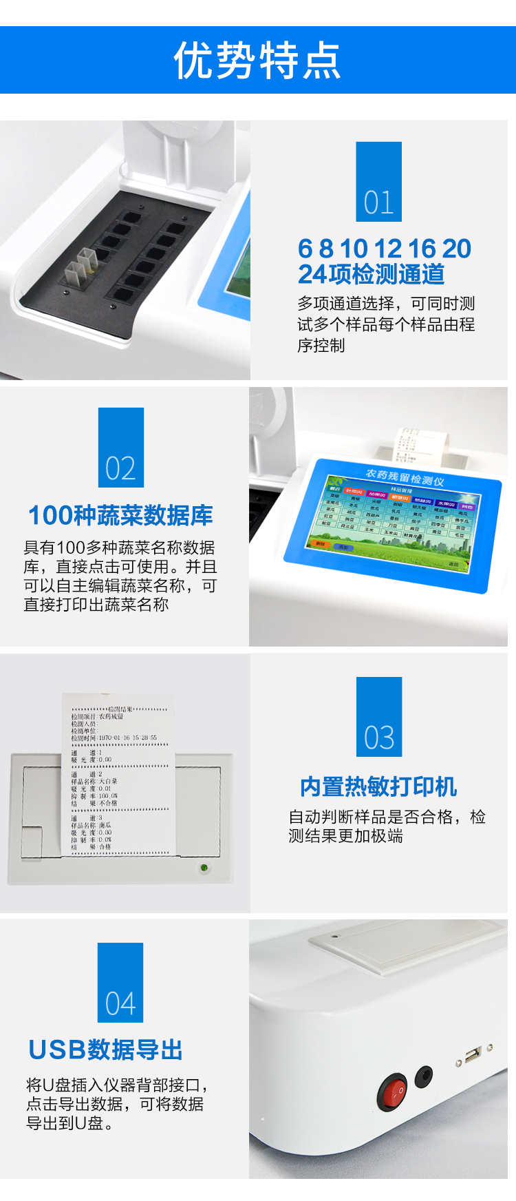 | 乙酰膽堿酯酶和丁酰膽堿酯酶試劑均可以使用,符合國家標(biāo)準(zhǔn)和農(nóng)業(yè)部標(biāo)準(zhǔn)的要求。 | 自動(dòng)判斷樣品是否合格,檢測結(jié)果更加直觀。 | 儀器具有100多種蔬菜名稱菜單庫,分類管理,并可按需添加或刪除蔬菜名,編輯蔬菜名稱,可直接打印出蔬菜名稱。 | 檢測通道:10個(gè)檢測通道,可以同時(shí)測試多個(gè)樣品,循環(huán)檢測,即放即檢,每個(gè)樣品由程序控制分別獨(dú)立工作,不會(huì)互相干擾。 | 智能操作系統(tǒng),采用更加人性化操作,主控采用多核處理器,主頻1.88Ghz,運(yùn)轉(zhuǎn)速度更快速,穩(wěn)定性更強(qiáng)。 | 顯示方式:7英寸高靈敏真彩觸摸屏顯示,人性化中文操作界面,讀數(shù)直觀、簡單。 | 打印機(jī)采用串口5v打印,可選擇手動(dòng)打印或者自動(dòng)打印,三分鐘出打印結(jié)果,打印格式為檢測人姓名、吸光度差值、檢測時(shí)間、檢測機(jī)構(gòu)、樣品名稱及結(jié)果判定。 | 光源采用進(jìn)口超高亮發(fā)光二極管,具有低功耗、高精度、穩(wěn)定性強(qiáng)、光源可控可以關(guān)掉不使用的光源,響應(yīng)速度快等優(yōu)點(diǎn)。 | 智能恒流穩(wěn)壓,光強(qiáng)自動(dòng)校準(zhǔn),長時(shí)間連續(xù)工作光源無溫漂現(xiàn)象。 | 儀器具有GPRS遠(yuǎn)傳功能,可插手機(jī)卡實(shí)現(xiàn)數(shù)據(jù)遠(yuǎn)傳平臺(tái),wifi聯(lián)網(wǎng)功能,可將數(shù)據(jù)快速上傳電腦,進(jìn)行數(shù)據(jù)管理與統(tǒng)計(jì)。 | 采用USB2.0接口設(shè)計(jì),方便數(shù)據(jù)的存貯和移動(dòng),并可隨時(shí)與計(jì)算機(jī)直接相連,并且可用計(jì)算機(jī)控制儀器。實(shí)現(xiàn)數(shù)據(jù)查詢、瀏覽、分析、統(tǒng)計(jì)、打印等。 | 智能化程度高,儀器具有自檢功能:具有開機(jī)自檢和調(diào)零功能,具有自動(dòng)檢測重復(fù)性功能 | 儀器具有自身保護(hù)功能,可設(shè)置用戶名及密碼,防止非工作人員操作等。 | 采用DC12v直流供電,安全系統(tǒng)更高,并且配備6A鋰電池充電器。 | 儀器具有重新校準(zhǔn)、鎖定、恢復(fù)出廠設(shè)置功能。 |