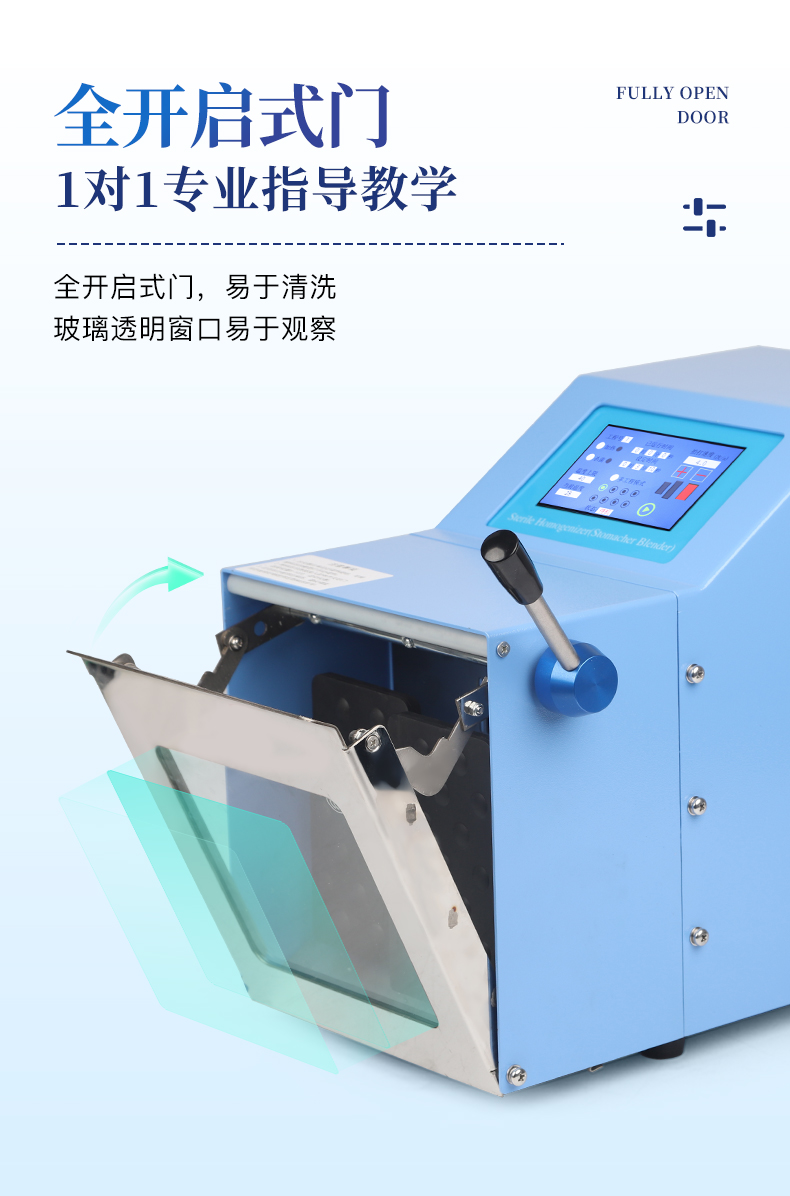 ●5英寸液晶顯示屏。    ●可儲存三組工作程序。    ●可調整的均質時間。    ●均質速度可調節或固定。    ●拍擊器可調整前后距離。    ●無菌一次性濾袋,保證衛生。    ●全開啟式門,易于清洗。    ●玻璃透明窗口易于觀察 。    ●樣品與均質儀無接觸,如無樣品泄露則不需進行系統清洗.    ●均質柔和、樣品零污染、無損傷、不升溫、不需要滅菌處理,不需洗刷器皿。