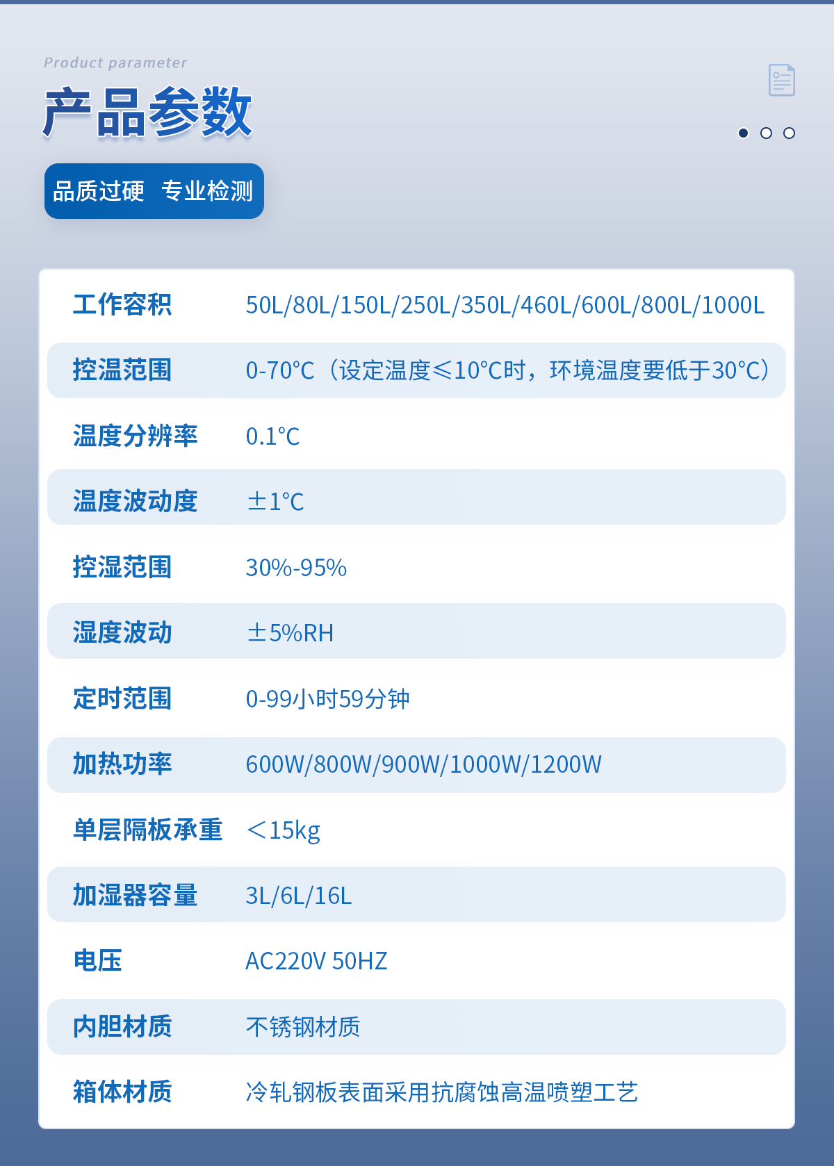 | 工作容積:70L | 控溫范圍:0-70℃(設(shè)定溫度≤10℃時,環(huán)境溫度要低于30℃) | 程序控制:24段 | 溫度分辨率:0.1℃ | 溫度波動度:±0.5℃ | 控濕范圍:30%-95% | 濕度波動:±5%RH | 定時范圍:0-99小時59分鐘 | 加熱功率:600W | 內(nèi)箱尺寸 寬*深*高(cm): 41*31*55 | 外箱尺寸 寬*深*高(cm):58*56*120 | 隔板層數(shù)(標(biāo)配):2層 | 層間隔/mm:39 | 卡槽層數(shù):8 | 加濕器容量(標(biāo)配):3L | 單層隔板承重:<10kg | 底部總承重 :25kg | 電壓:AC220V 50HZ | 整機(jī)重量:64kg | 內(nèi)膽材質(zhì):8K鏡面不銹鋼 | 箱體材質(zhì):冷軋鋼板表面采用抗腐蝕高溫噴塑工藝 | 旗艦款升級項(xiàng)目:升級內(nèi)置鋼化玻璃門,內(nèi)置220V電源插座。 |