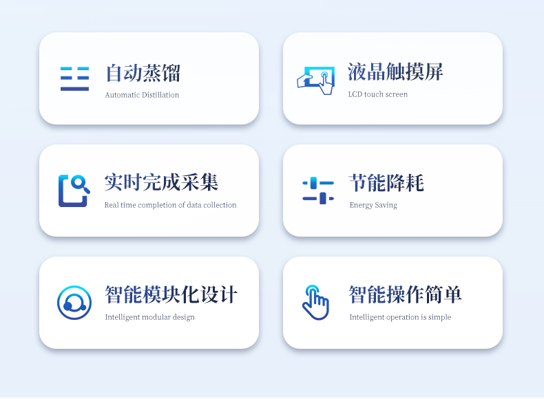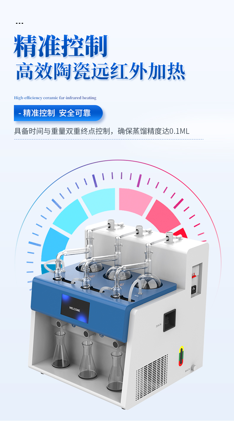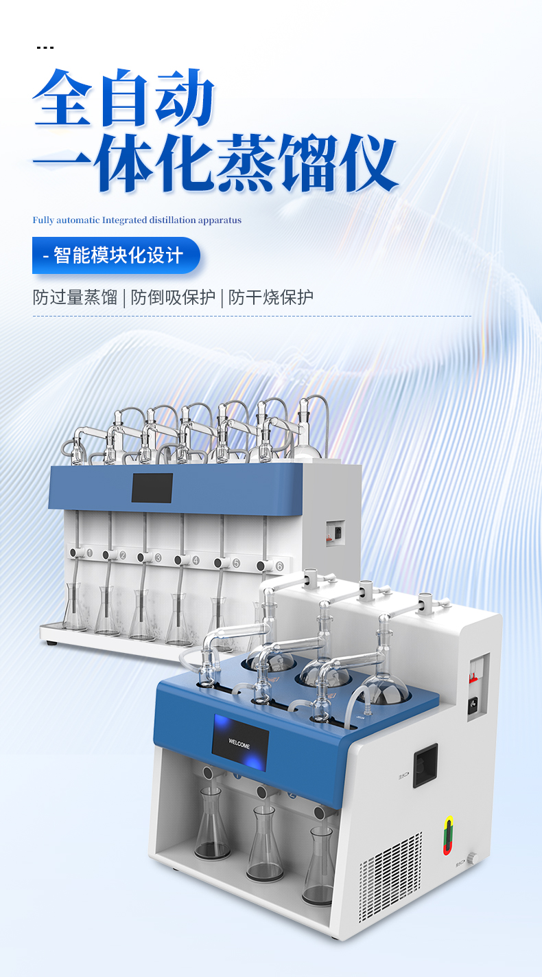 智能一體化蒸餾儀采用智能模塊化設計:方法自定義設置保存/讀取、開機自動調取使用,冷凝單元特殊定制蛇形冷凝管、智能終點控制防過量蒸餾、防倒吸保護,防干燒保護、實現了智能操作簡單、自動蒸餾、美觀實用、節能降耗、節省人工的同時為用戶做樣提**率節約人員成本開銷。