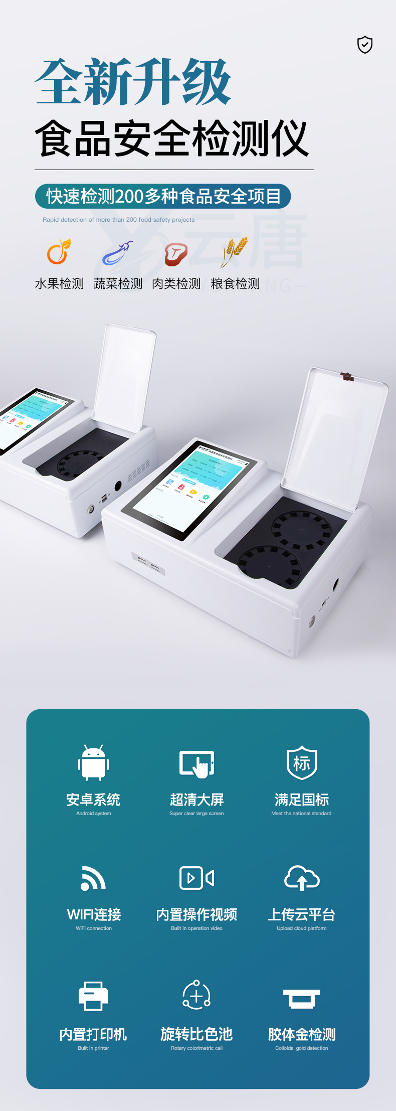 1、儀器采用臺式一體化系統檢測技術,將分光光度模塊、膠體金檢測模塊、新型農殘檢測模塊、數字化管理模塊、無線通訊模塊高度集成于一體,支持檢測200種食品安全檢測項目,同時預留升級檢測方法。