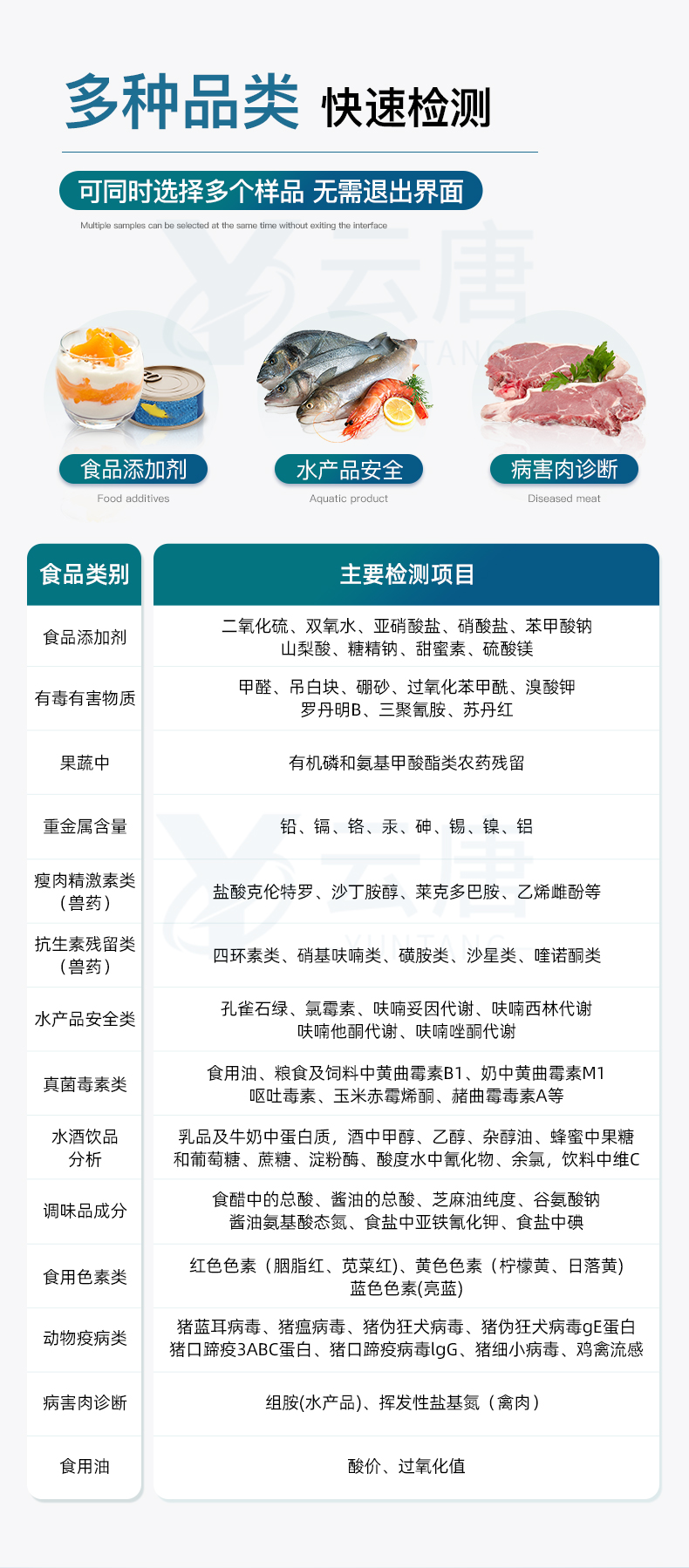 山東藍虹光電科技有限公司生產的高智能食品安全檢測儀為集成化食品安全快速檢測分析設備,采用臺式一體化設計,可快速檢測200多種食品安全項目,包含非食用化學物質、濫用食品添加劑、農藥殘留、獸藥殘留、重金屬、病害肉、營養強化劑、抗生素類殘留、激素類殘留、真菌毒素類殘留、化學類殘留等項目的定性定量檢測。