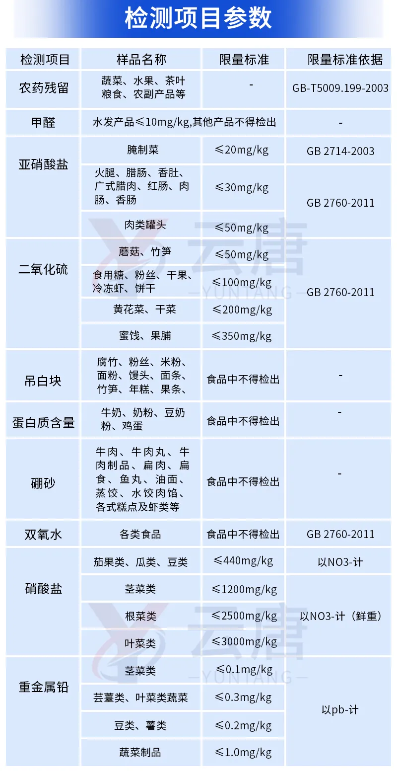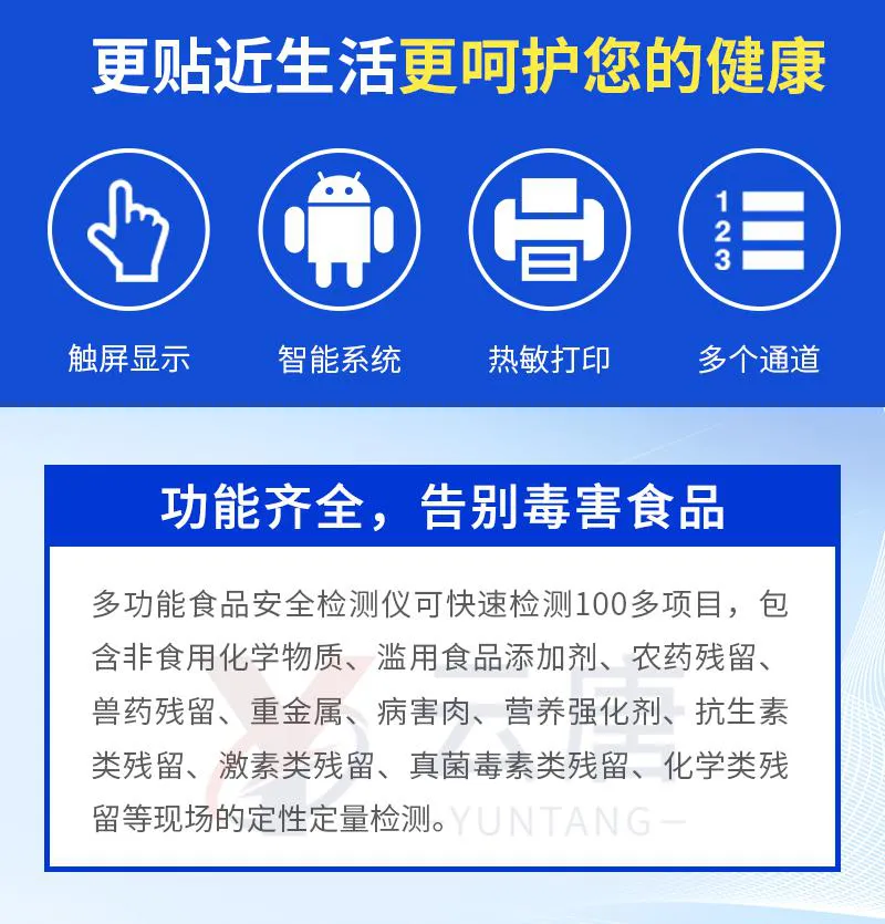 可快速檢測各類食品中的甲醛、吊白塊、二氧化硫、亞硝酸鹽、雙氧水、硼砂、農藥殘留、乳及乳制品中蛋白質的含量,儀器預留其他項目檢測程序和端口,根據日后需求可方便的自主增加檢測項目。