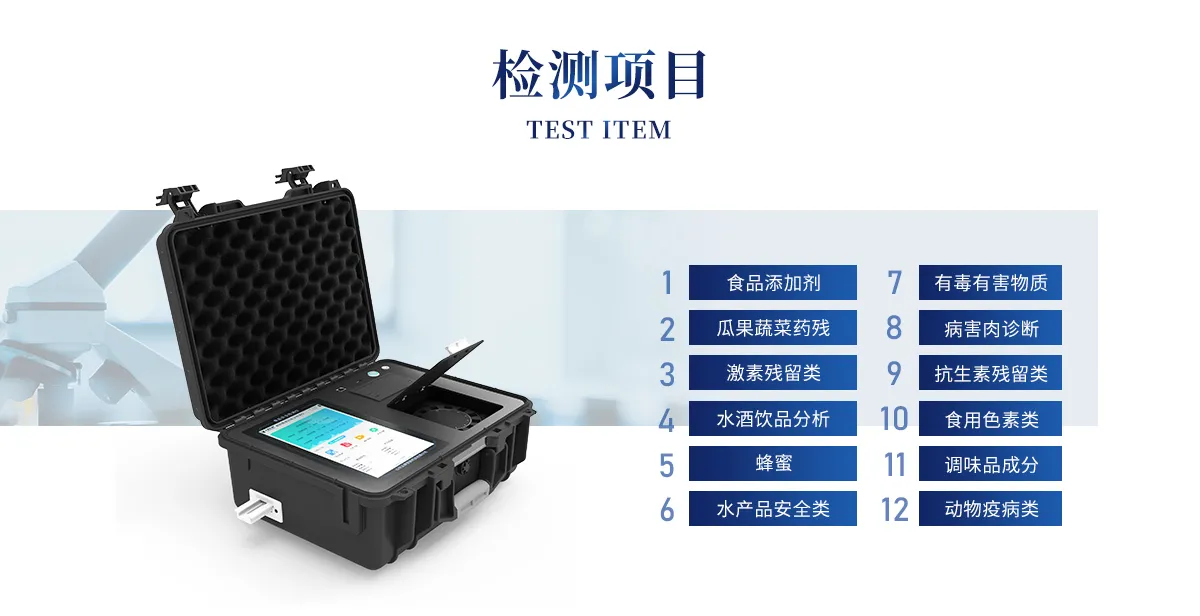 多功能食品安全檢測儀可快速檢測200多項目,包含非食用化學(xué)物質(zhì)、濫用食品添加劑、農(nóng)藥殘留、獸藥殘留、重金屬、病害肉、營養(yǎng)強化劑、抗生素類殘留、激素類殘留、真菌毒素類殘留、化學(xué)類殘留等現(xiàn)場的定性定量檢測。