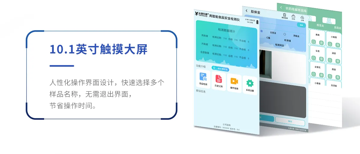 6、一體化便攜式快檢設(shè)備,滿足現(xiàn)場及流動檢測使用需求,能夠在同一軟件下實現(xiàn)所有檢測項目的檢測,并可通過同一窗口直觀顯示檢測結(jié)果。