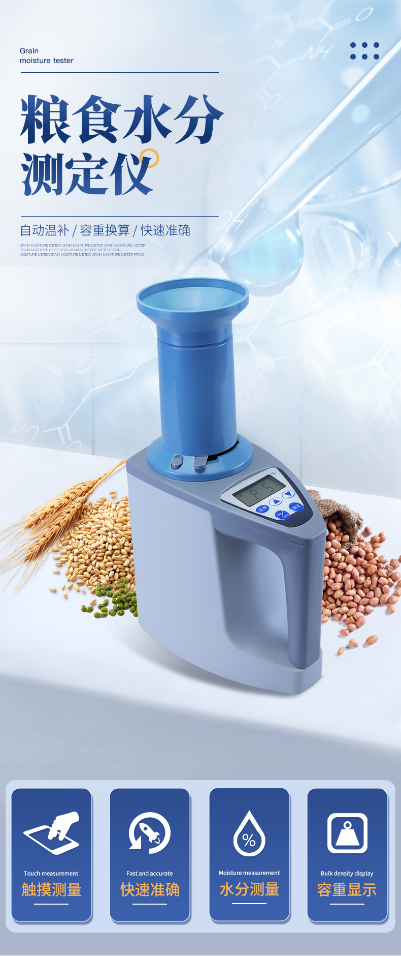 操作簡單:20個常見品種已預先定標,不需秤樣、用料簡取樣后可立即測量水分