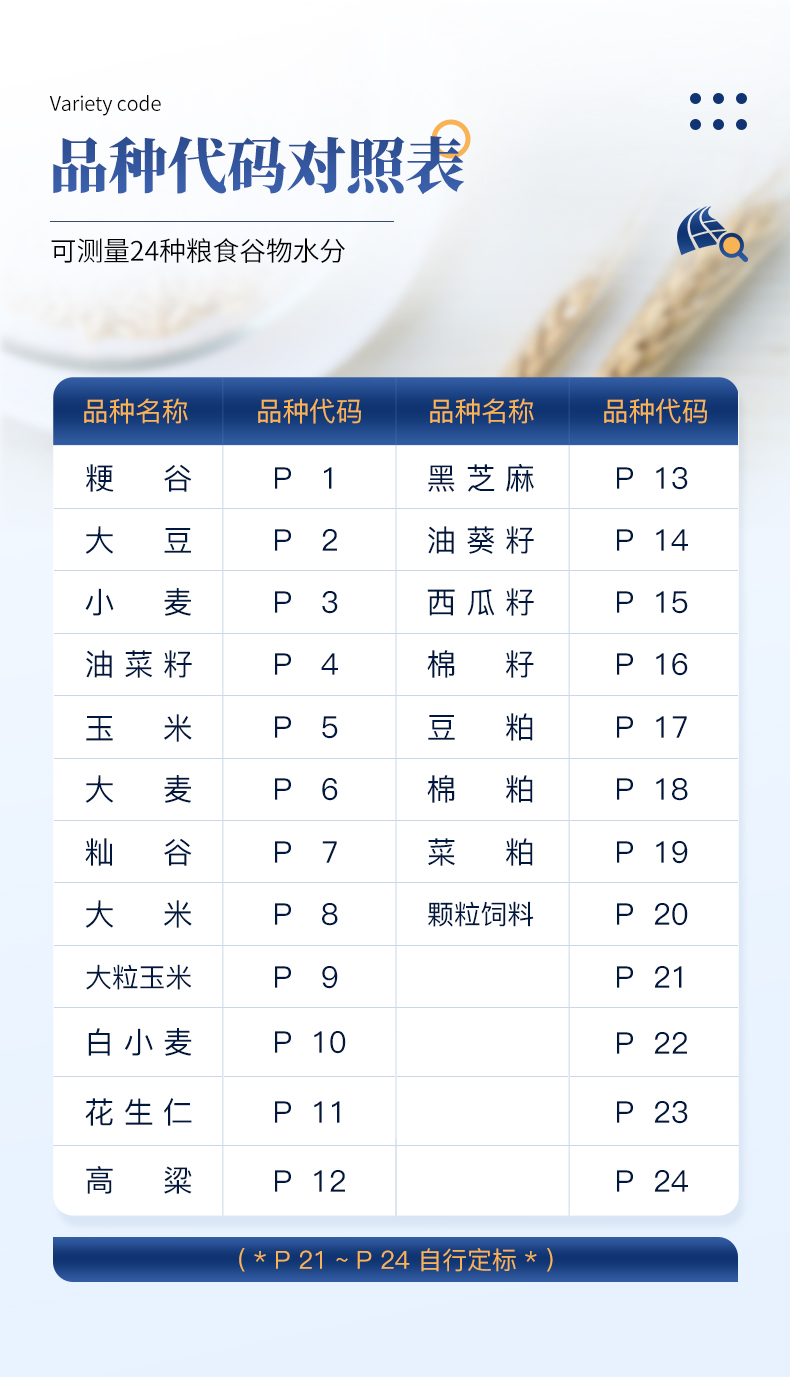 測量范圍:可測量谷類、玉米、東北玉米、大麥、小麥、白小麥、大米、豆粕、花生仁、菜粕、高粱、黑芝麻、棉籽、棉粕、秈谷、大豆、油菜籽、飼料、蔬菜種子等非金屬顆粒狀物質。