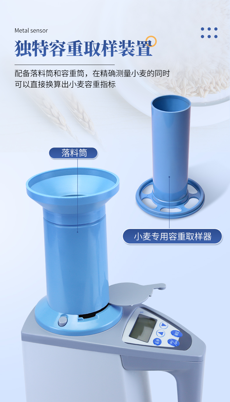 容重換算:獨特的專利容重取樣裝置在**測量小麥的同時,可以直接換算出小麥容重指標。