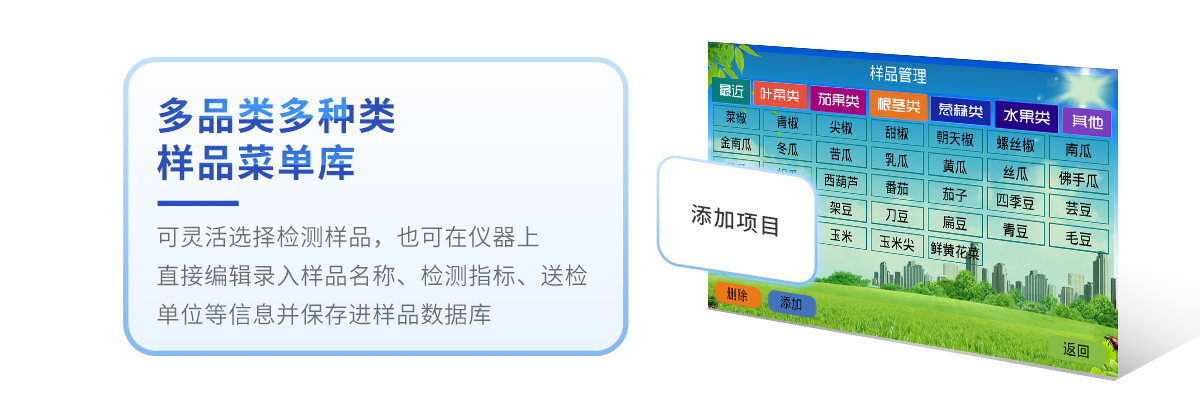 10、儀器具有多品類多種類樣品菜單庫,可靈活選擇檢測樣品,不同的檢測通道可同時檢測不同的樣品項目。也可在儀器上直接編輯錄入樣品名稱、檢測指標、送檢單位等信息并保存進樣品數據庫。