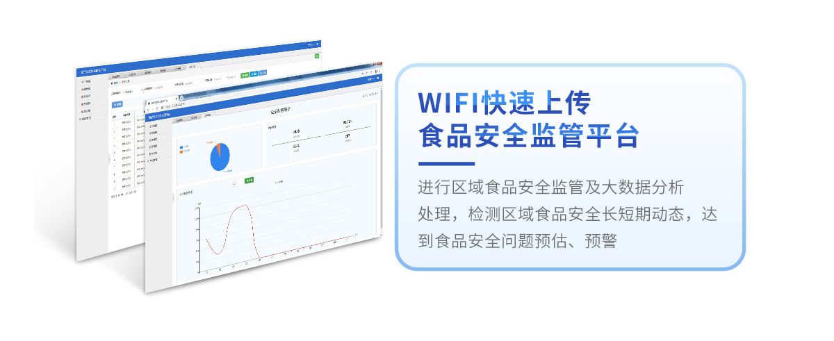 8、儀器帶有監管平臺。數據可局域網和互聯網數據上傳,檢測結果直接傳至食品安全監管平臺。進行區域食品安全監管及大數據分析處理,檢測區域食品安全長短期動態,達到食品安全問題預估、預警