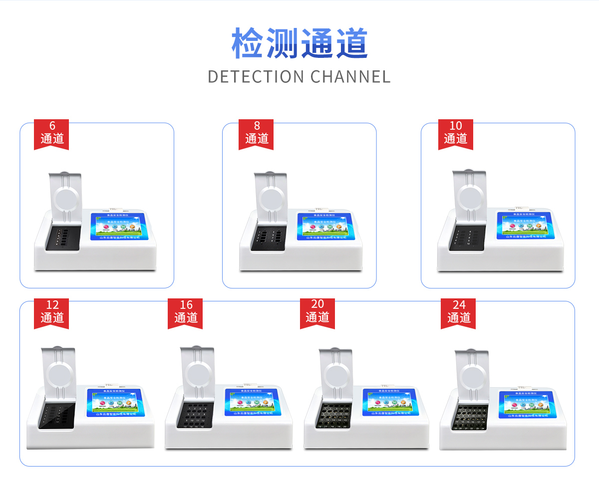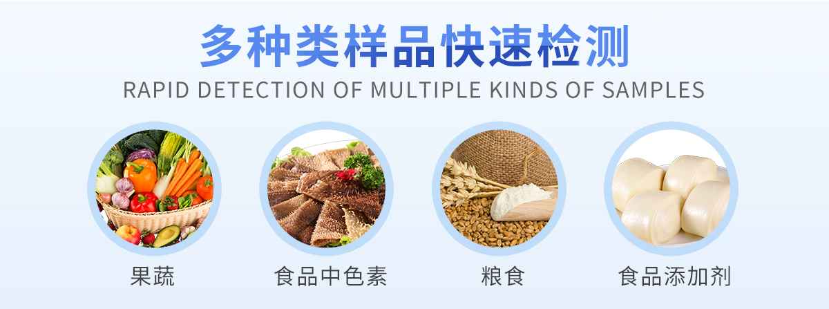 可快速檢測各類食品中的亞硝酸鹽、二氧化硫、甲醛、吊白塊、雙氧水、硼砂、農藥殘留、乳及乳制品中蛋白質、硝酸鹽、重金屬鉛的含量,儀器預留其他項目檢測程序和端口,根據日后需求可方便的自主增加檢測項目。