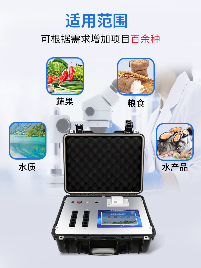 重金屬檢測儀可廣泛應用于大米、糧谷、果品、蔬菜、藥材、水質、水產品中重金屬鉛、鎘、六價鉻、汞、砷、鐵、鎳、鋁的快速檢測,檢測項目可根據客戶的需求定制。