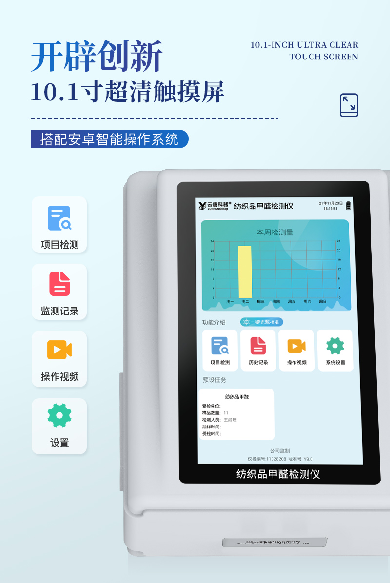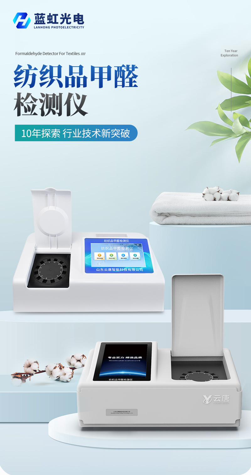 該紡織品甲醛檢測設備滿足紡織品甲醛含量檢測的中國標準《國家紡織產品基本安全技術規范》(GB 18401-2010)、《紡織品.甲醛的測定.第1部分:游離和水解的甲醛(水萃取法)》(GB/T 2912.1-2009), 適合各種紡織品、服裝等的甲醛含量檢測。
