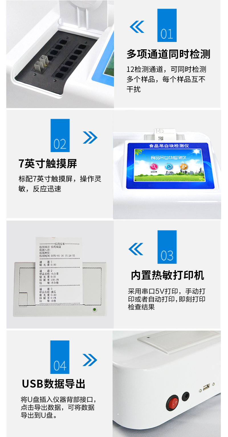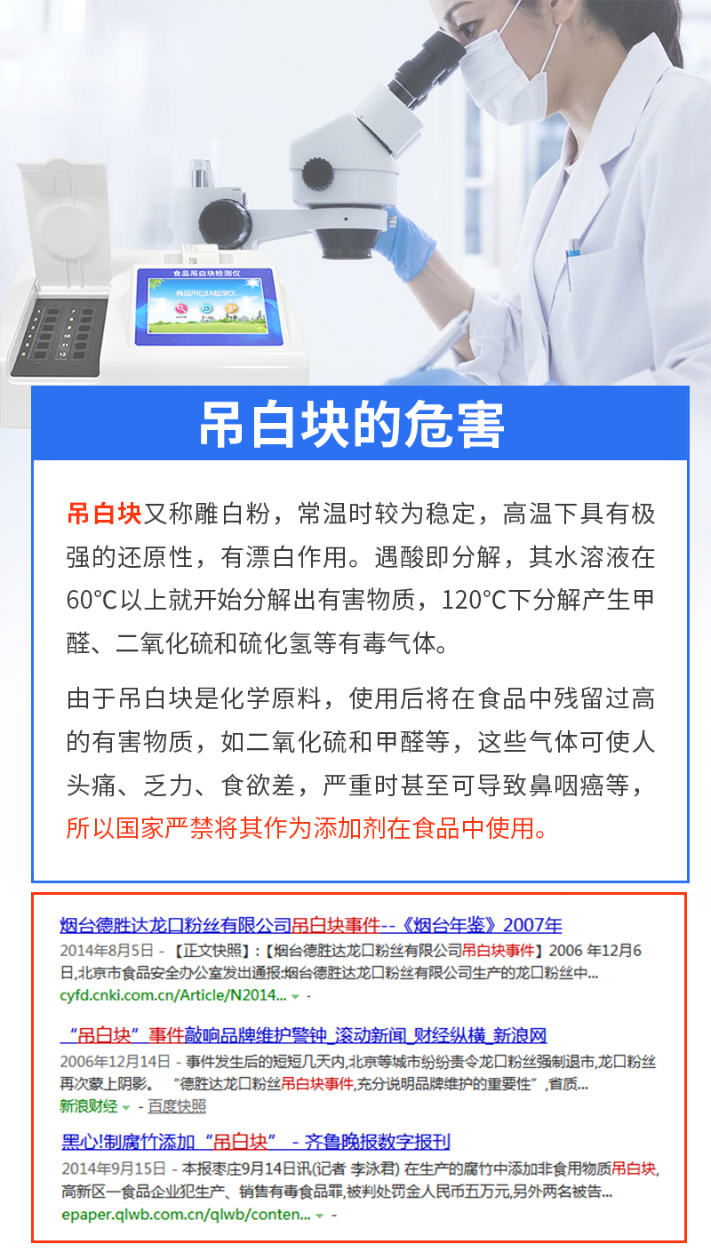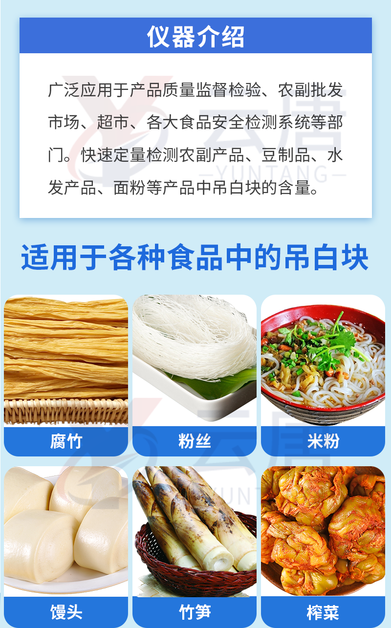 1、 檢測(cè)項(xiàng)目:用于快速檢測(cè)食品中吊白塊,儀器預(yù)留其他項(xiàng)目檢測(cè)程序和端口,根據(jù)日后需求可方便的自主增加檢測(cè)項(xiàng)目。日后可升級(jí)為檢測(cè),水產(chǎn)品,肉制品,面制品的綜合類(lèi)型儀器。