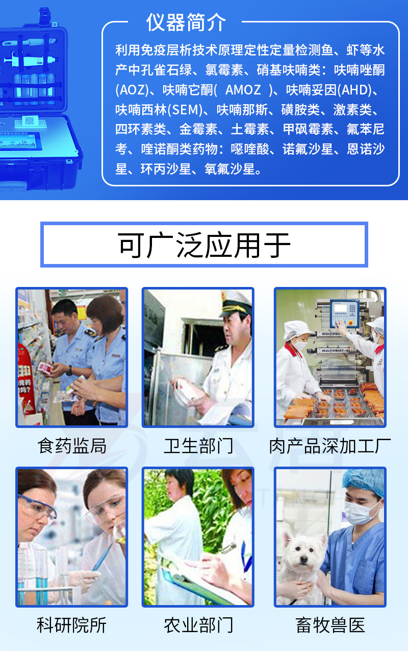 水產品藥物殘留檢測儀適用于魚、蝦等水產中孔雀石綠、氯霉素、硝基呋喃類:呋喃唑酮(AOZ)、呋喃它酮( AMOZ )、呋喃妥因(AHD)、呋喃西林(SEM)、呋喃那斯、磺胺類、激素類、四環素類、金霉素、土霉素、甲砜霉素、氟苯尼考、喹諾酮類藥物:噁喹酸、諾氟沙星、恩諾沙星、環丙沙星、氧氟沙星的定性定量檢測。