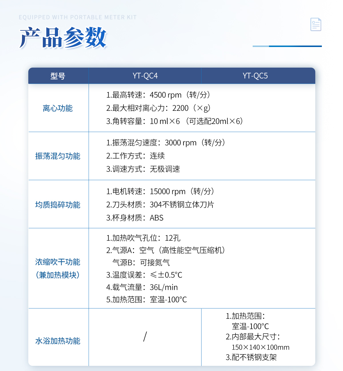 | 離心功能 1.**轉(zhuǎn)速:4500 rpm(轉(zhuǎn)/分) 2.**相對離心力:2200(×g) 3.角轉(zhuǎn)容量:10 mlx6 (可選配20mlx6) | 振蕩混勻功能 1.振蕩混勻速度:3000 rpm(轉(zhuǎn)/分) 2.工作方式:連續(xù) 3.調(diào)速方式:無極調(diào)速 | 均質(zhì)搗碎功能 1.電機(jī)轉(zhuǎn)速:15000 rpm(轉(zhuǎn)/分) 2.刀頭材質(zhì):304不銹鋼立體刀片 3.杯身材質(zhì):ABS | 濃縮吹干功能(兼加熱模塊) 1.加熱吹氣孔位: 12孔 2.氣源A: 空氣(高性能空氣壓縮機(jī)) 氣源B: 可接氮?dú)? 3.溫度誤差:≤±0.5℃ 4.載氣流量:36L/min 5.加熱范圍:室溫-100℃ | 水浴加熱 1.加熱范圍:室溫-100℃ 2.內(nèi)部**尺寸:150mmX140mmX100mm 3.配不銹鋼支架 |