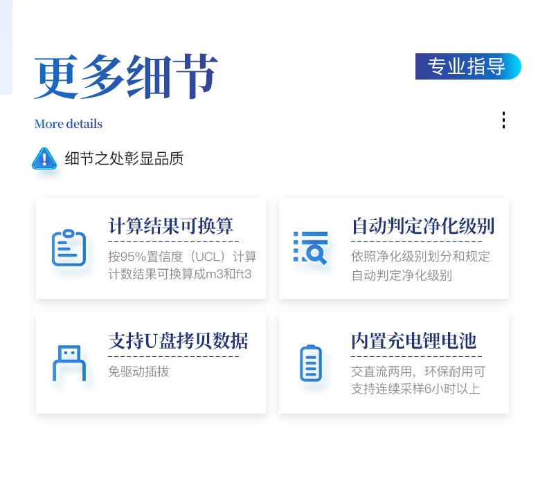 1、安卓系統(tǒng)7.1版本,操作交互體驗(yàn)更好。 2、內(nèi)置溫濕度傳感器、環(huán)境氣壓傳感器 3、核心部件光散射傳感器明顯消除腔體的雜散光,信噪比大為提高。從而使測(cè)量更準(zhǔn)確更可靠。 4、按95%置信度(UCL)計(jì)算,計(jì)數(shù)結(jié)果可換算成m3和ft3 5、依照凈化級(jí)別劃分和規(guī)定,自動(dòng)判定凈化級(jí)別,使用便利。 6、支持wifi、藍(lán)牙傳輸,數(shù)據(jù)可無線上傳;同時(shí)支持U盤拷貝數(shù)據(jù),免驅(qū)動(dòng)插拔。 7、配置監(jiān)管平臺(tái),檢測(cè)結(jié)果可直接無線傳至平臺(tái),進(jìn)行潔凈度長短期分析,輔助管理。 8、內(nèi)置新一代高速熱敏打印機(jī),可選擇所需要打印的粒徑通道,靈活打印結(jié)果。 9、交直流兩用,內(nèi)置充電鋰電池,環(huán)保耐用可支持連續(xù)采樣6小時(shí)以上。 10、便捷簡(jiǎn)易伸縮式云臺(tái)支架,安裝采樣操作更加方便。