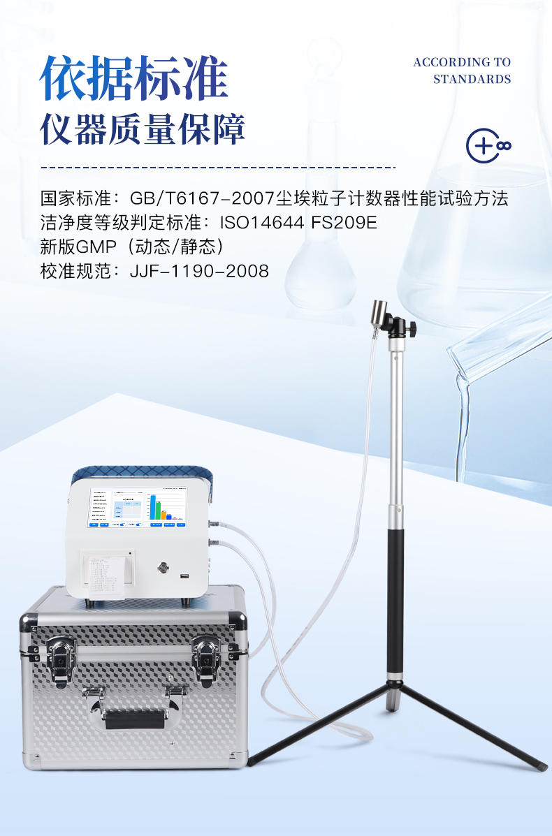 國家標準:GB/T6167-2007塵埃粒子計數器性能試驗方法 潔凈度等級判定標準:ISO14644 FS209E ,新版GMP(動態/靜態) 校準規范:JJF-1190-2008