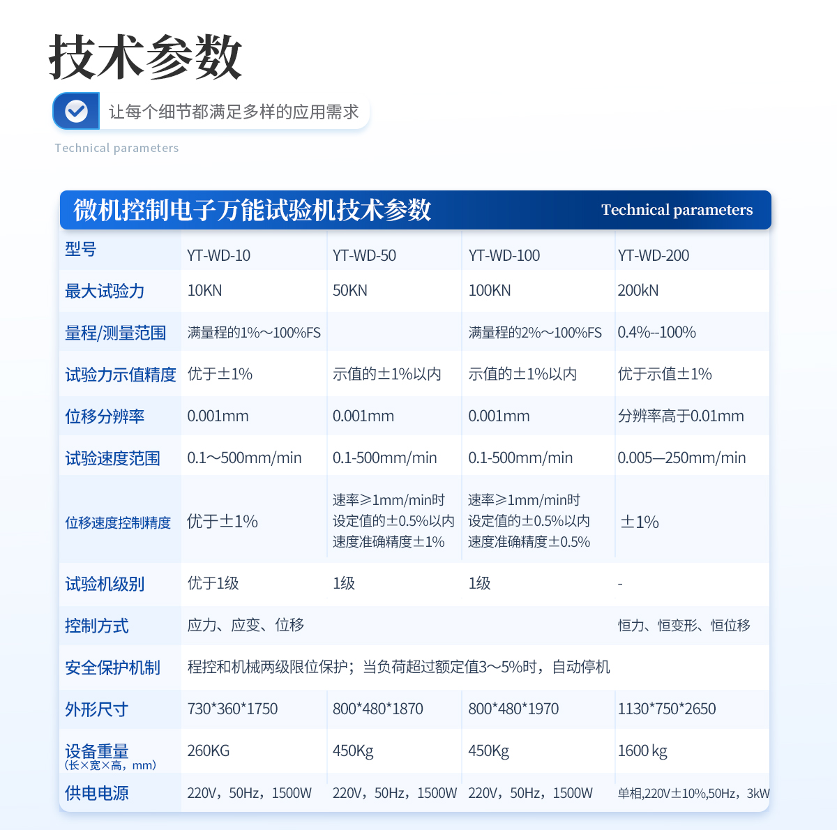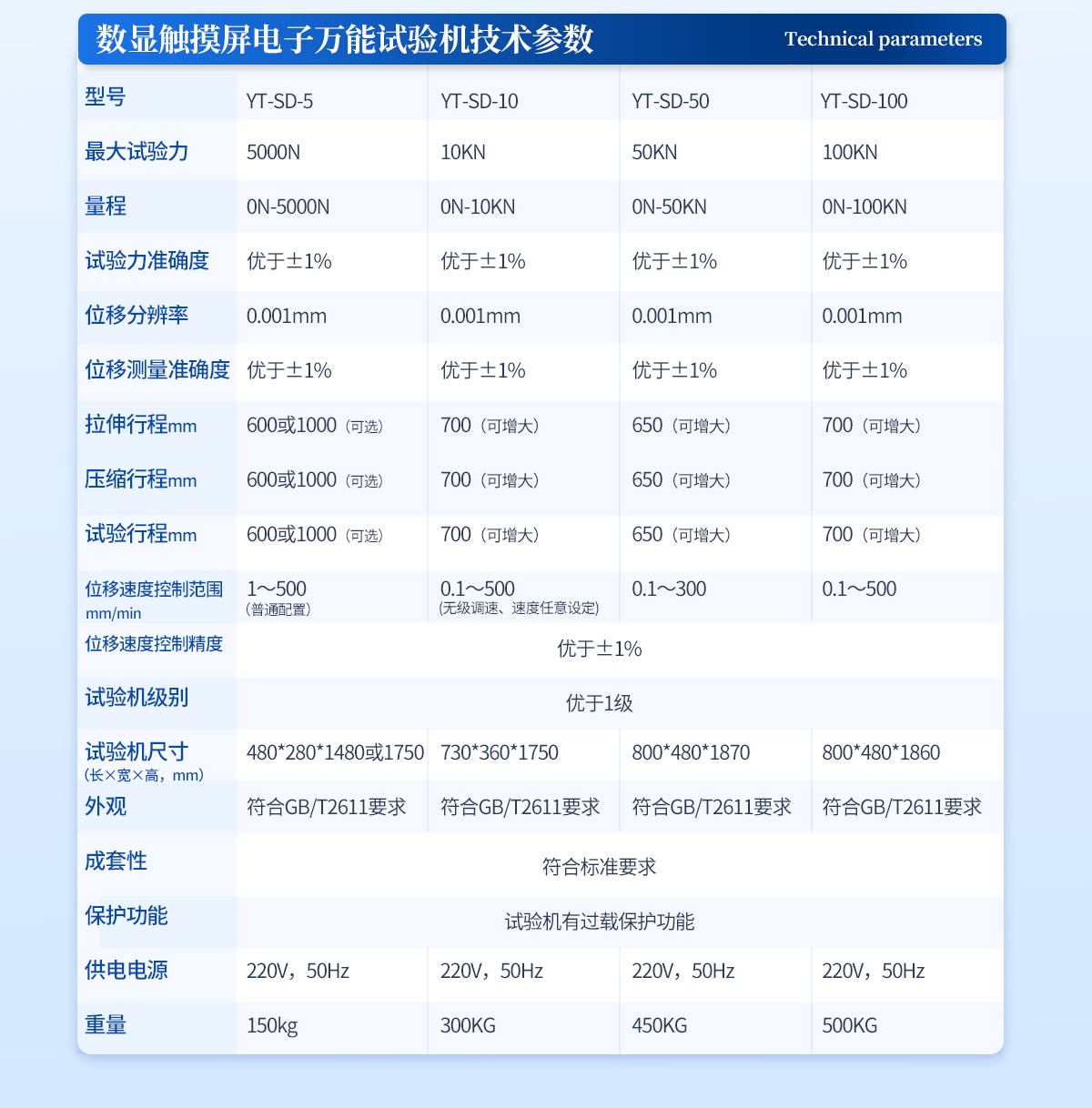 | 1、**試驗力:10KN ; | 2、量 程:0N-10KN; | 3、試驗力準確度;優于±1%,(試驗力全程不分檔,全程分辨率不變) | 4、位移分辨率:0.001mm; | 5、位移測量準確度:優于±1%; | 6、拉伸行程:700mm(可增大) | 7、壓縮行程:700mm(可增大) | 8、試驗行程:700mm(可增大) | 9、位移速度控制范圍: 0.1mm/min~500mm/min(無級調速、速度任意設定) | 10、位移速度控制精度:優于±1%; | 11、試驗機級別:優于1級 | 12、試驗機尺寸:730*360*1750 mm | 13、外觀:符合GB/T2611要求 | 14、成套性:符合標準要求 | 15、保護功能:試驗機有過載保護功能 | 16、供電電源:220V,50Hz | 17、重量:300KG |