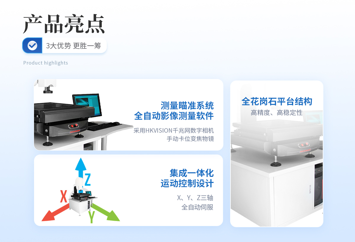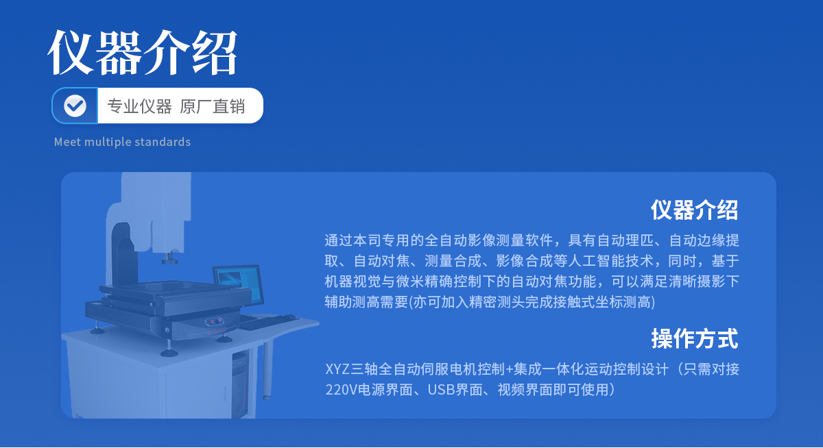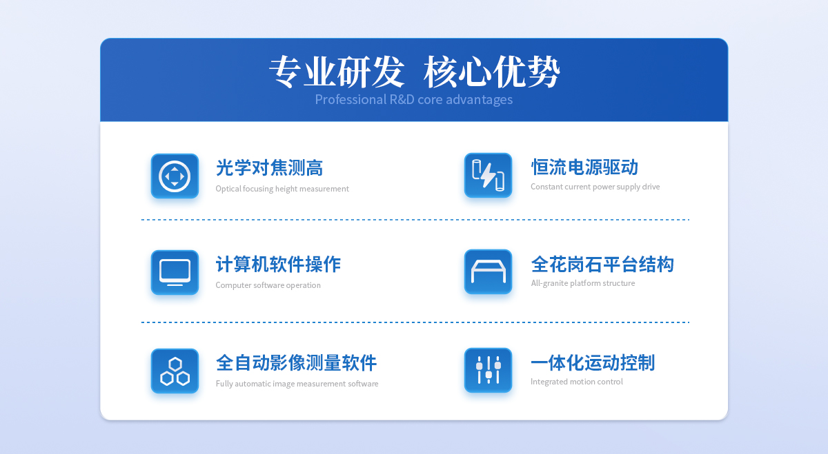| 儀器基座 精磨高精度高穩定性硬質鑄鋁 1套 | CCD 700TVL模擬信號高清彩色CCD(COMST) 1個 | 鏡頭 0.7~4.5 X連續變焦鏡頭 1個 | 光柵尺 高精度位移傳感電子尺,分辨率:1μm (精微) 2條 | 導軌 咸陽藍博P級精密交叉導軌(LB) 3組 | 傳動 西德無牙光桿精密傳動(西德) 3條 | 表面光源 LED恒流環形驅動光源 (兩環一區) 1個 | 底光源 LED白色恒流底光源 1PCS | 數據采集卡 DC3000 1PCS | 視頻采集卡 視頻采集卡 1PCS | 影像測量軟件 DTV 2.5T手動影像測量軟件 1套 | 光學校正片 DTV 定制 1塊 | 電壓 AC :100-240V(全電壓) 1個 |