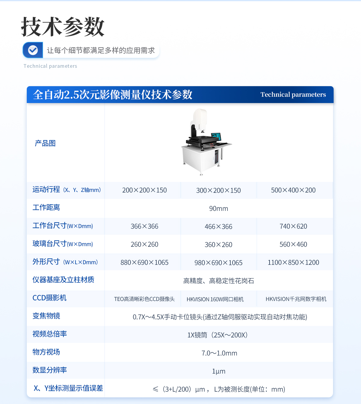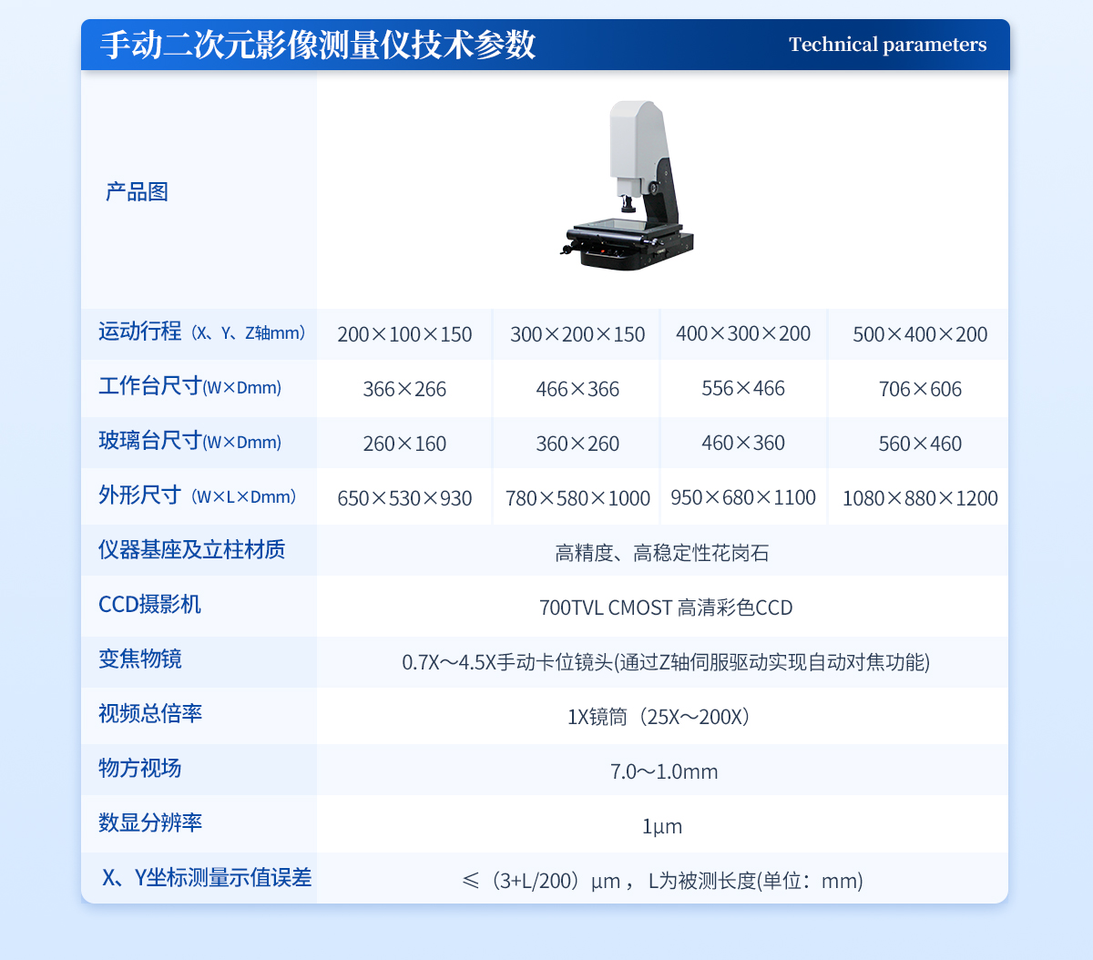 | l 運動行程(X、Y、Z軸mm):100×100×75 | l 工作臺呎寸(W×Dmm): 232×232 | l 玻璃臺呎寸(W×Dmm): 110×110 | l 外形尺寸(W×L×Dmm): 300×450×650 | l 工作距離:90mm | l 儀器材質: 高精度硬質鋁基座+航空鋁工作臺 | l CCD攝影機:COMST 700TVL模擬信號高清彩色CCD | l 變焦物鏡: 0.7X~4.5X連續變焦鏡頭 | l 視頻總倍率:1X鏡筒(25X~200X) | l 物方視場: 7.0~1.0mm | l 數顯分辨率:1μm | l X、Y坐標測量示值誤差≤(3+L/200)μm , L為被測長度(單位:mm) | l 操作方式:手動移動平臺 |