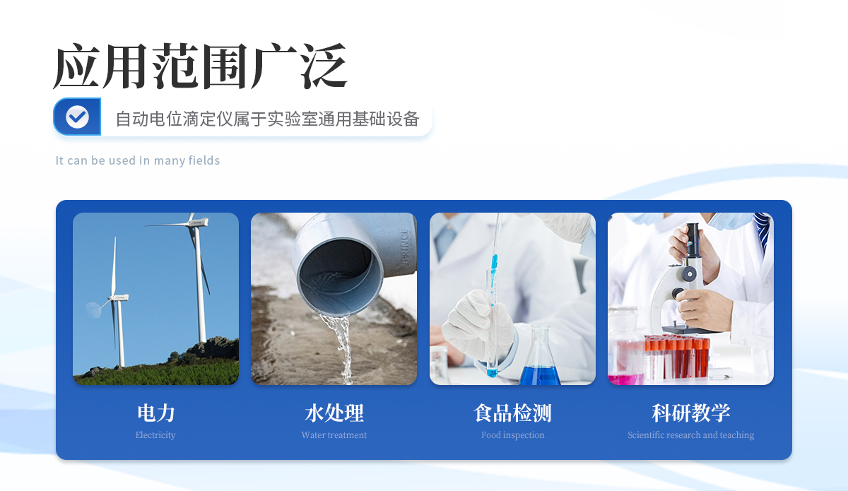 | 自動電位滴定儀屬于實驗室通用基礎(chǔ)設(shè)備,使用非常廣泛,可應(yīng)用在食品、藥檢、疾控、商檢、水處理、石油、化工、海洋、電力、環(huán)保、新能源、教學、科研等相關(guān)領(lǐng)域。 |