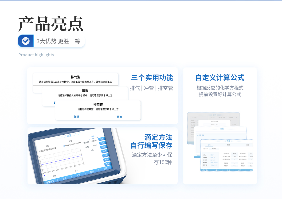 | 1、設(shè)備支持電位滴定和pH值測量;用戶選擇不同電極可進行酸堿滴定、氧化還原滴定、沉淀滴定、絡(luò)合滴定等多種滴定和pH測量; | 2、用戶可選配電導(dǎo)滴定、永停滴定等擴展模塊,滿足用戶多功能需求; | 3、設(shè)備對國家標準中采用的電位滴定法均滿足,用戶可根據(jù)檢測需求選擇適配的電極即可; | 4、支持動態(tài)滴定、等量滴定、手動滴定的滴定方式,可預(yù)設(shè)滴定終點或自動識別終點滴定,方便用戶根據(jù)樣品特性選擇**滴定工作流程; | 5、可自定義計算公式,根據(jù)反應(yīng)的化學方程式提前設(shè)置好計算公式,滴定完成后將自動獲得待測物含量; | 6、滴定方法可自行編寫并保存,形成滴定方法快捷模式,在使用時可直接選擇運行,滴定方法至少可保存100種; | 7、設(shè)備可作為實驗室常規(guī)手動滴定的滴定裝置使用;計量泵替代滴定管,磁力攪拌功能替代手動搖晃錐形瓶的工作; | 8、儀器實用的三個功能: (1)排氣,可將滴定管或管路內(nèi)的氣泡排出,避免氣泡帶來的滴定誤差; (2)沖管,可以*少的試劑消耗量使管路內(nèi)充滿試劑,實現(xiàn)節(jié)省試劑的同時減少試劑混合引入的滴定誤差; (3)排空管,可在實驗完成后將管路中的液體收集到滴定管內(nèi),避免在拆卸管路時產(chǎn)生藥液濺灑問題。 |
